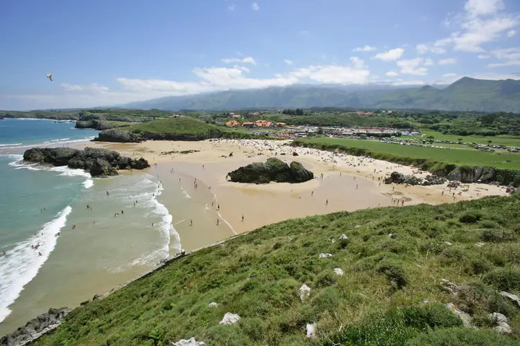 Playa de Bretones. El arenal de Vidiago fascina a muchos bañistas. Dividido en dos por una pequeña prominencia, a modo de apéndice de unos acantilados sobre los que se ha acondicionado un camping. A la izquierda se encuentra la Playa d ...